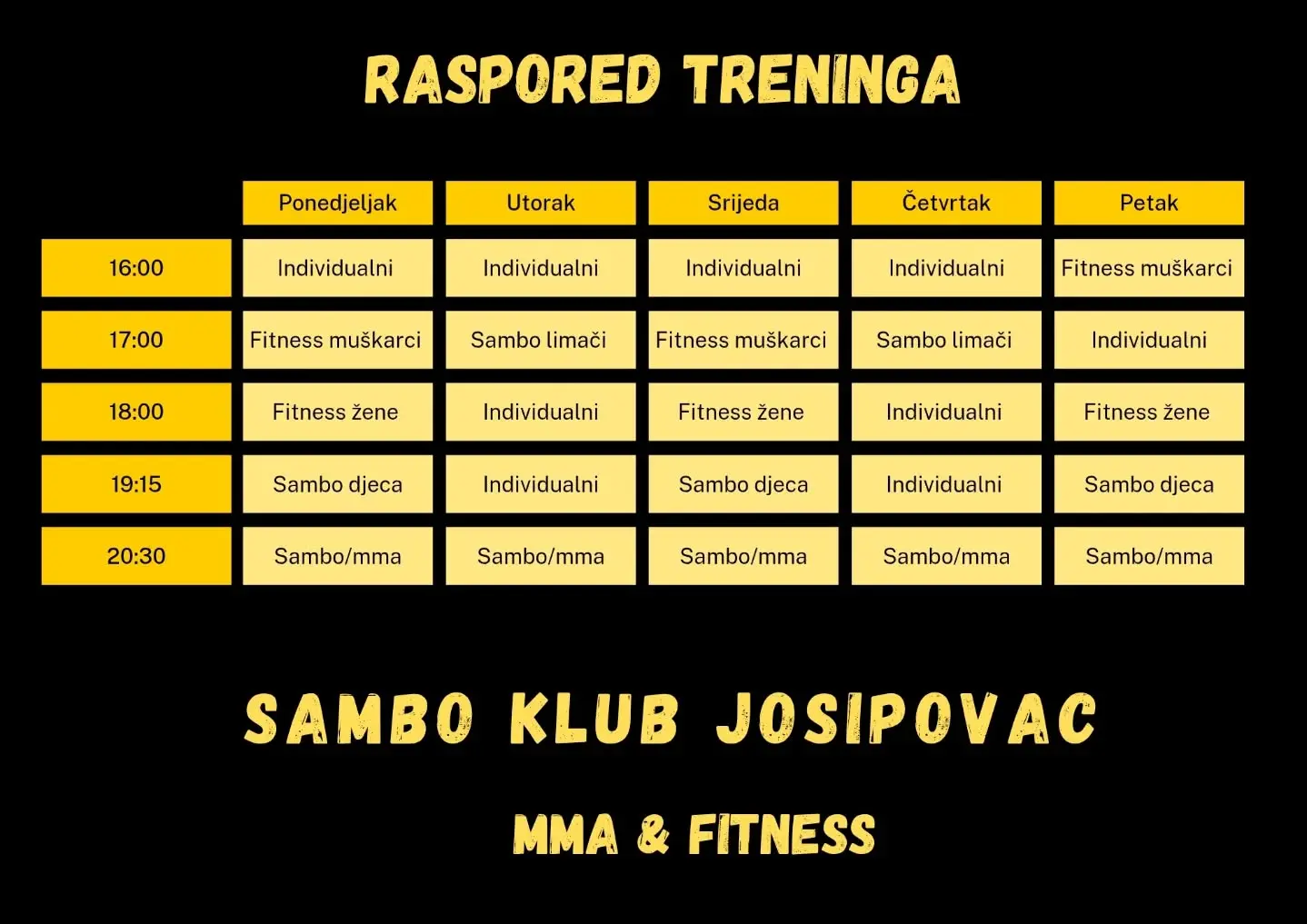 | 17:00 | Fitness muškarci | Sambo limači | Fitness muškarci | Sambo limači | Individualni |